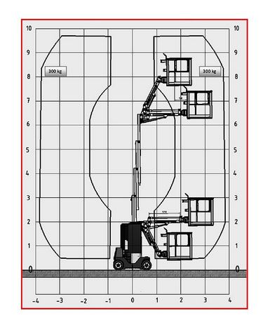 Arbeitshöhe 9,70 m Plattformhöhe 7,90 m Plattformgröße 1,29 x 0,89 x 1,10 m Bühnentragkraft 300 kg Drehbereich 355° Korb schwenkbar 2 x 55° Seitliche Reichweite 4 m Durchfahrthöhe 1,99 m Fahrzeugbreite 0,98 m Fahrzeuglänge 3,40 m Eigengewicht 4000 kg Antrieb elektrisch / Batterie Sonstiges geringer Wenderadius durch Lenkeinschlag 85°, nicht markierende Bereifung Führerscheinklasse kein Führerschein erforderlich -