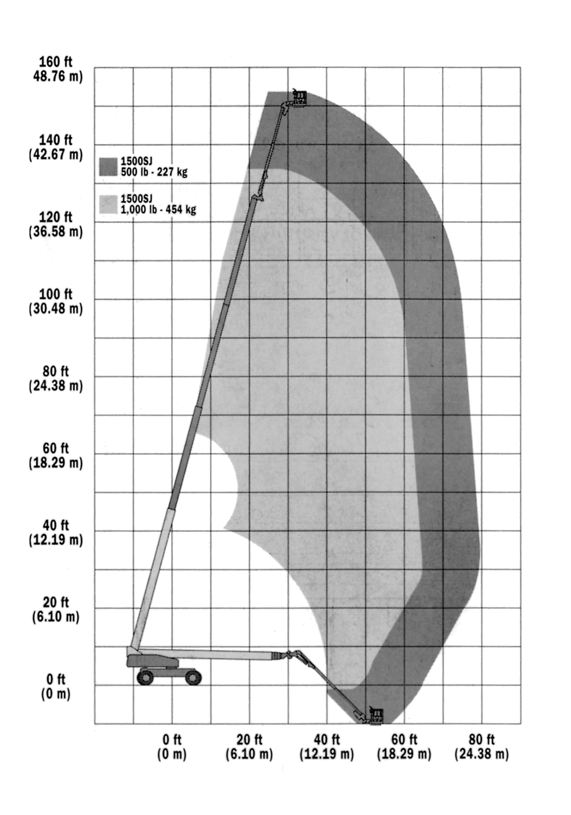 Arbeitshöhe 47.70 Plattformhöhe 45.70 Plattformgröße 2,44 x 0,91 x 1,10 m Bühnentragkraft 450/230 kg Drehbereich 360° Korb schwenkbar 2 x 90° Seitliche Reichweite 24,38 m Durchfahrthöhe 3,05 m Fahrzeugbreite 2,49 m/3,81 m Fahrzeuglänge 13,11 m Eigengewicht 22000 kg Antrieb 4x4-Allrad Sonstiges Steigfähigkeit 40 %, Arbeitshöhe bei 450kg eingeschränkt Führerscheinklasse kein Führerschein erforderlich -