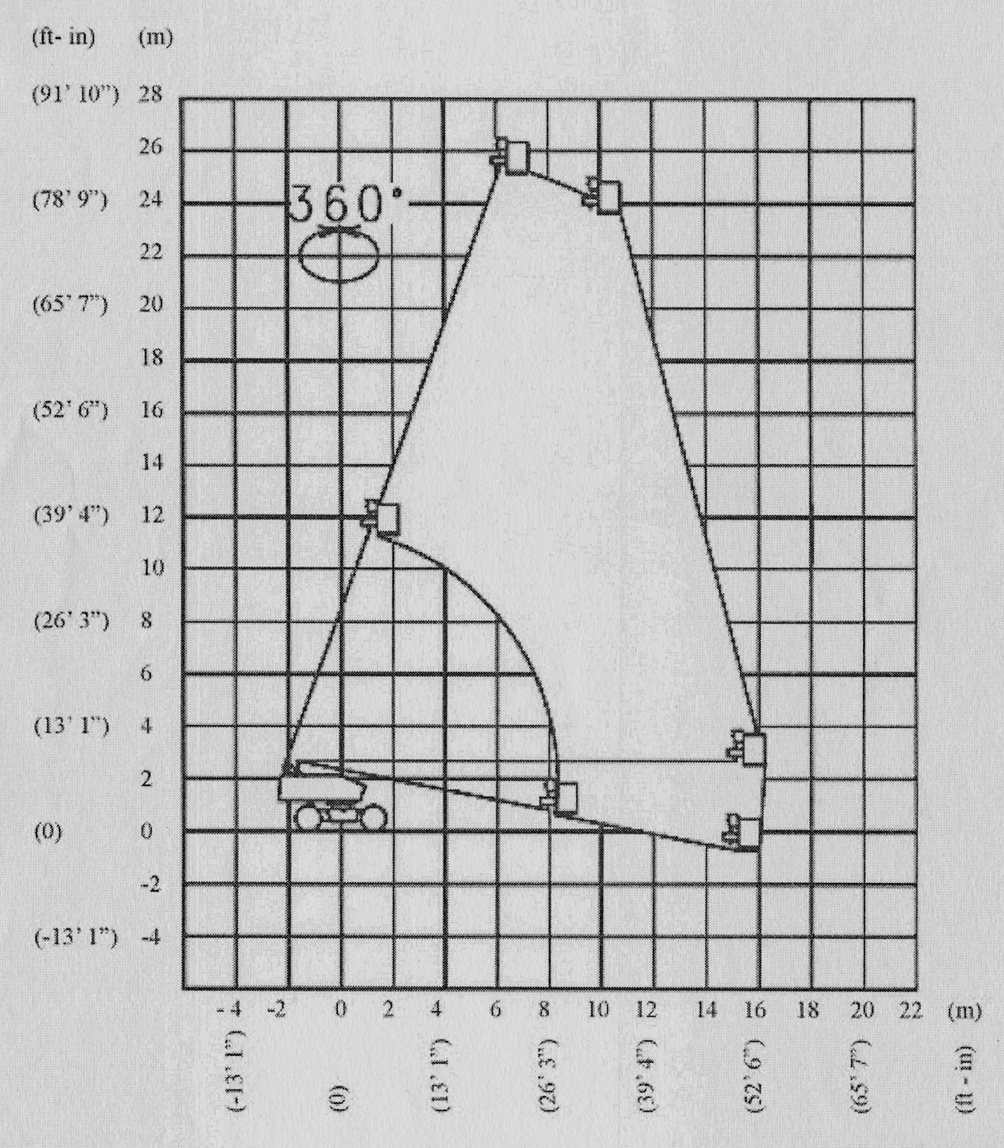 Arbeitshöhe 27,00 m Plattformhöhe 25,00 m Plattformgröße 1,80 x 0,75 x 1,10 m Bühnentragkraft 227 kg Drehbereich 360° Korb schwenkbar 2 x 90° Seitliche Reichweite 16,20 m Durchfahrthöhe 2,68 m Fahrzeugbreite 2,43 m Fahrzeuglänge 11,52 m Eigengewicht 14700 kg Antrieb 4x4-Allrad Sonstiges max. Steigfähigkeit 45% Führerscheinklasse kein Führerschein erforderlich -