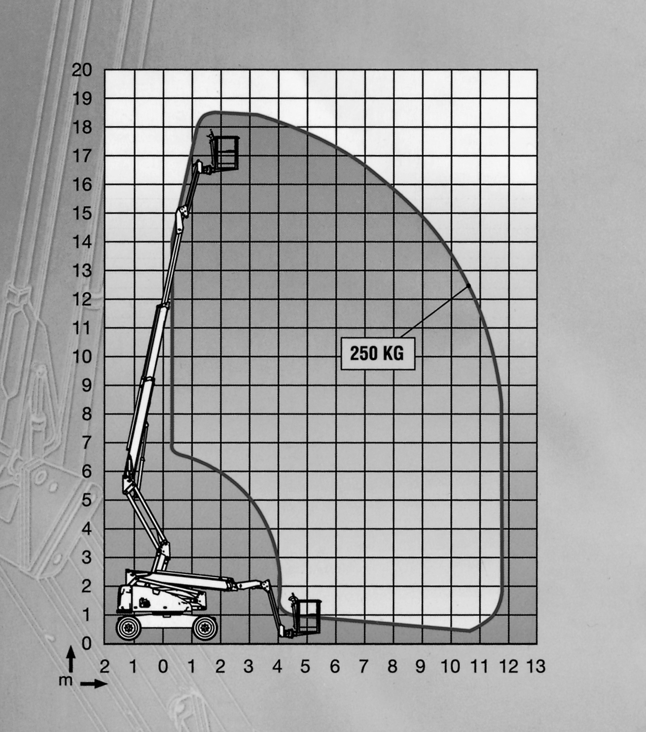 Arbeitshöhe 18,50 m Plattformhöhe 16,50 m Plattformgröße 1,80 x 0,80 x 1,10 m Bühnentragkraft 250 kg Drehbereich endlos Korb schwenkbar 2 x 90° Seitliche Reichweite 11,70 m Durchfahrthöhe 2,56 m Fahrzeugbreite 2,29 m Fahrzeuglänge 5,85 m Eigengewicht 8000 kg Antrieb Diesel Sonstiges optional 230 V Antrieb, max. Steigfähigkeit 45% Führerscheinklasse kein Führerschein erforderlich -