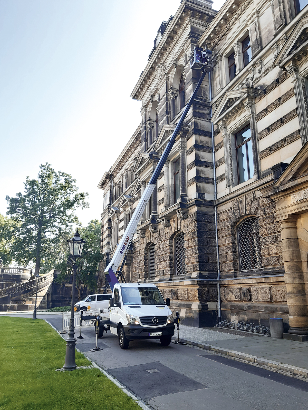 Arbeitshöhe 23.00 Plattformhöhe 21.00 Plattformgröße 1,4 x 0,7 x 1,1 m Bühnentragkraft 230 kg Drehbereich 355° Seitliche Reichweite 12,00 m (100kg) Abstützbreite mind. 2,20 m / max. 3,20 m Durchfahrthöhe 2,96 m Fahrzeugbreite 2,43 m Fahrzeuglänge 7,74 m Eigengewicht 3500 kg Antrieb LKW-Motor Sonstiges Reichweite nach hinten 15,10 m (100 kg), H-Abstützung, 1-seitige oder bündige Abstützung möglich Führerscheinklasse Klasse B -