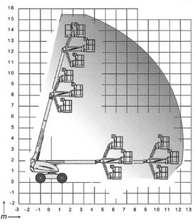 Arbeitshöhe 15,44 m Plattformhöhe 13,44 m Plattformgröße 1,8 x 0,8 x 1,1 m Bühnentragkraft 230 kg Drehbereich endlos Korb schwenkbar 2 x 90° Seitliche Reichweite 12,30 m Durchfahrthöhe 2,50 m Fahrzeugbreite 2,33 m Fahrzeuglänge 6,71 m Eigengewicht 6800 kg Antrieb 4x4-Allrad Sonstiges max. Steigfähigkeit 50 %, 37 cm Bodenfreiheit Führerscheinklasse kein Führerschein erforderlich -