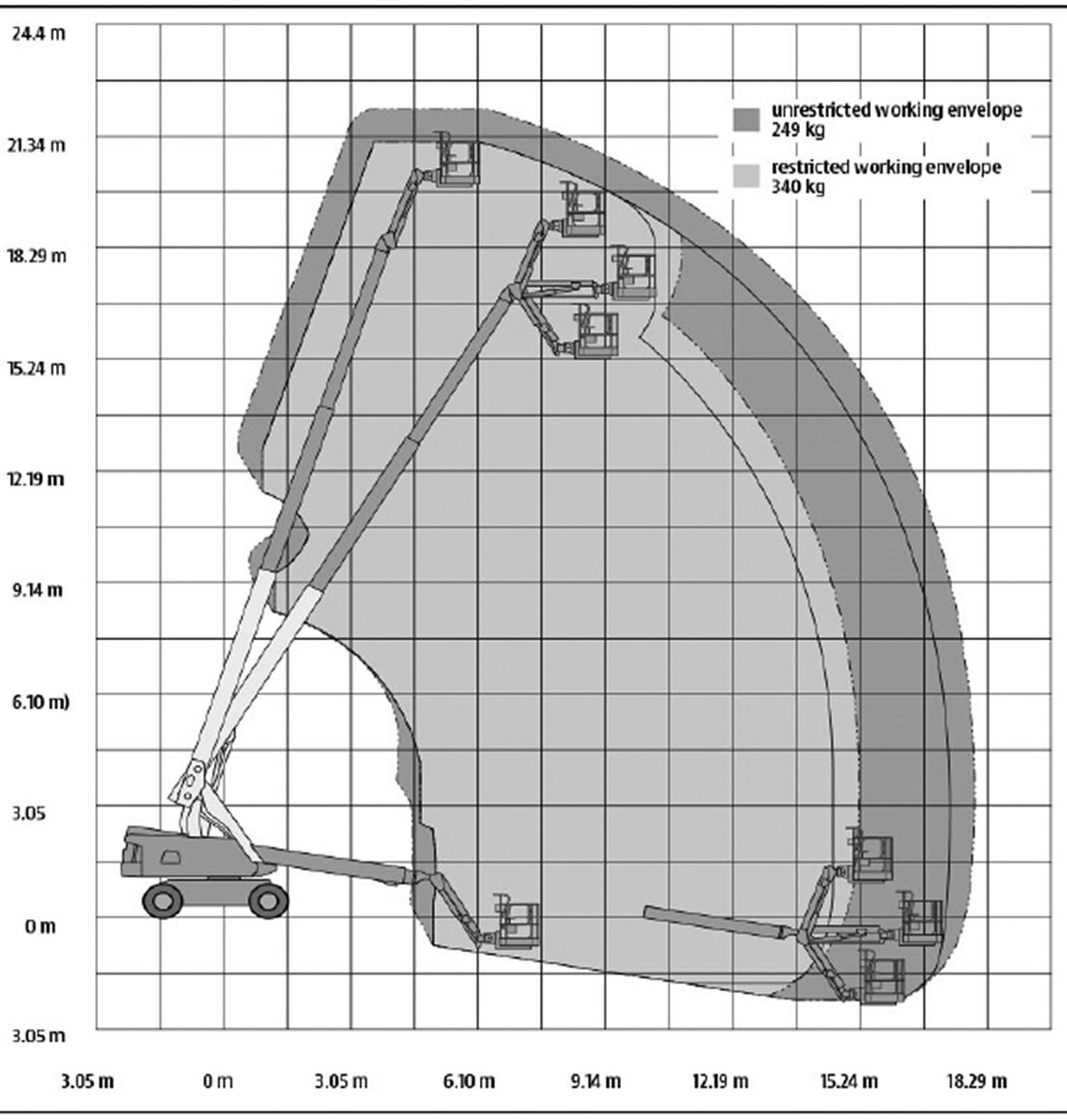 Arbeitshöhe 22.00 Plattformhöhe 20.00 Plattformgröße 1,83 x 0,76 x 1,1 m Bühnentragkraft max. 230/340 kg Drehbereich 360° Korb schwenkbar 2 x 90° Seitliche Reichweite 17,40 m (250 kg) Durchfahrthöhe 2,50 m Fahrzeugbreite 2,48 m Fahrzeuglänge 10,79 m Eigengewicht 12000 kg Antrieb 4x4-Allrad Sonstiges max. Steigfähigkeit 45%, wahlweise Arbeitskorb 0,91 x 2,44 m, Pendelachse Führerscheinklasse kein Führerschein erforderlich -