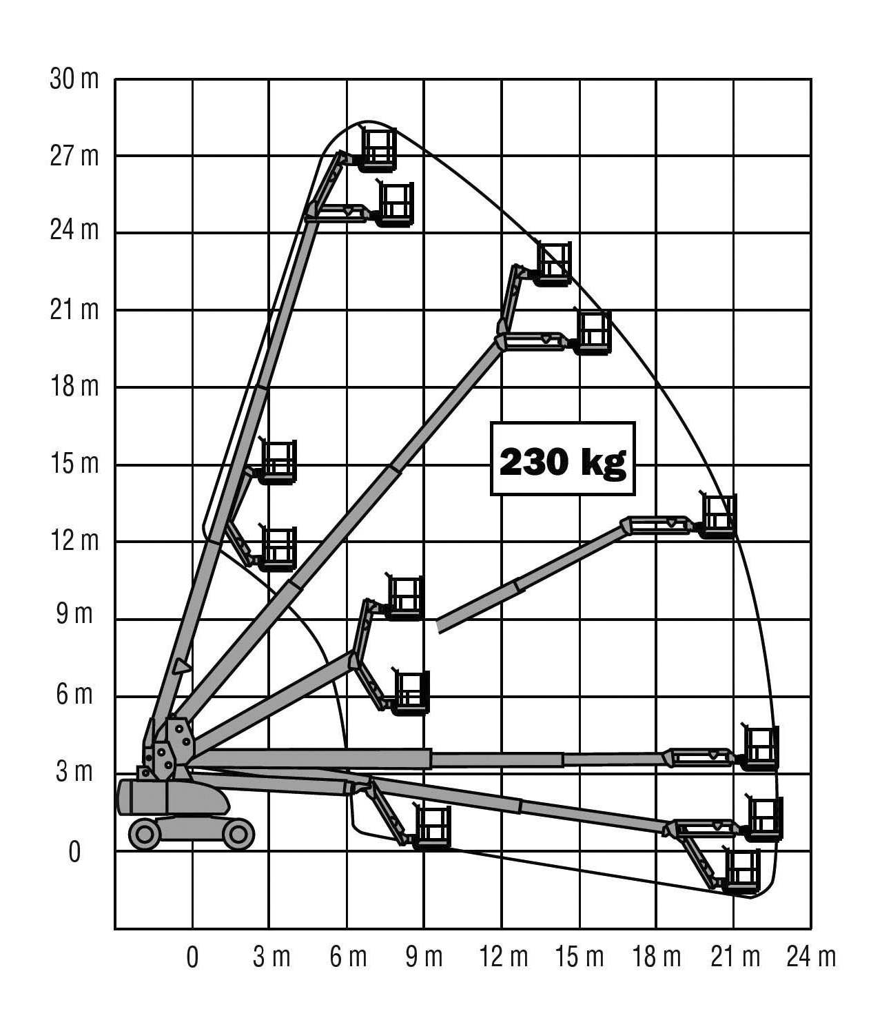 Arbeitshöhe 28,20 m Plattformhöhe 26,20 m Plattformgröße 2,44 x 0,91 x 1,10 m Bühnentragkraft 230 kg Drehbereich 360° Korb schwenkbar 2 x 90° Seitliche Reichweite 22,86 m Durchfahrthöhe 3,05 m Fahrzeugbreite 2,49 m Fahrzeuglänge 12,19 m Eigengewicht 17200 kg Antrieb 4x4-Allrad Sonstiges max. Steigfähigkeit 45% Führerscheinklasse kein Führerschein erforderlich -