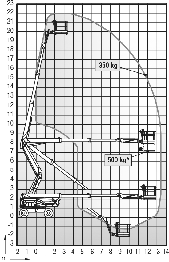 Arbeitshöhe 21,95 m Plattformhöhe 19,95 m Plattformgröße 1,3 x 2,4 x 1,1 m Bühnentragkraft 350 kg Drehbereich endlos Korb schwenkbar 2 x 150° Seitliche Reichweite 13,4 m Durchfahrthöhe 2,56 m Fahrzeugbreite 2,33 m Fahrzeuglänge 8,15 m Eigengewicht 11900 kg Antrieb 4x4-Allrad Sonstiges Staplerfunktion mit 500 kg Tragkraft, max. Steigfähigkeit 45%, Ausgleich und Bedienung der Stützen bei max. 12° Steigung Führerscheinklasse kein Führerschein erforderlich -